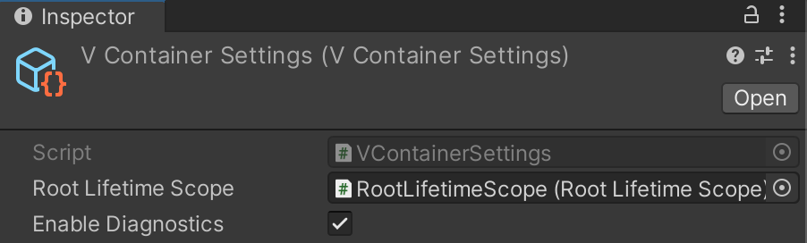 - VContainerSettings のインスペクタから、 Enable Diagnostics のチェックを有効にします。