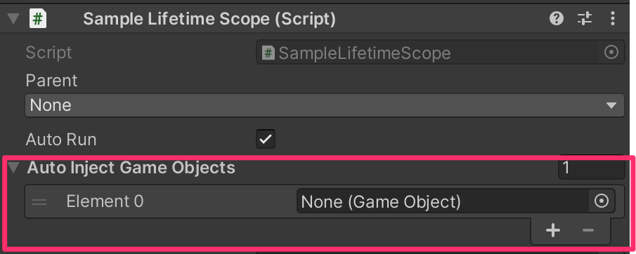 1. シーン上の特定の MonoBehaviour への インジェクションのみが必要な場合は、LifetimeScope のインスペクタからGameObjectを設定します。